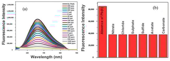 (a) Fluorescence intensity in the presence of Pb2+ of different concentrations. (b) Fluorescence intensity in the presence of different types of Pb2+ salts [].