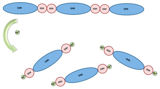 Different shapes of NPs were adopted in other reports. For example, GSH mediated end-to-end assembled gold nanorod (GNR) chains []. After GNRs of a certain aspect ratio and dimension were synthesized using gold seeds, they were functionalized with GSH. Because GSH tends to complex with GNRs at the endpoints of {111} facets through (-SH) groups, the appended zwitterionic of GSH at the GNR endpoints will become coupled by a two-point electrostatic interaction. The GNRs are then aligned to form a chain through the end-to-end linkage. The chain formations of the GNR were found to be broken in the presence of 0.025 mM Pb2+, and a number of dimers were observed. The mechanism is depicted in Figure 4, including the processes of assembly and disassembly.