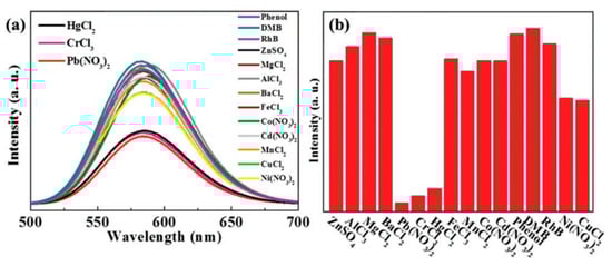 Detection results using a quantum dot and layered double hydroxide (QD–LDH) sensor in the presence of different metal ions: (a) Luminescence spectra, (b) intensities [].