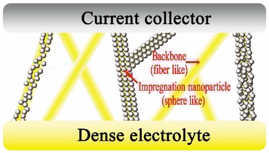 The TPB length is a critical geometric parameter of the electrode and dominates the SOFC and electrode performance [,]. Meanwhile, the TPB itself is strictly associated with the electrode micromorphology [,]. To further improve the electrode performance, many studies focused on deriving an optimal micromorphology from various fabricating processes, such as screen-printing [,], freeze-casting/phase inversion [,], co-precipitation [], impregnation/infiltration [,], and electrospinning [,]. Several types of electrodes with distinct microstructures have been successfully prepared.