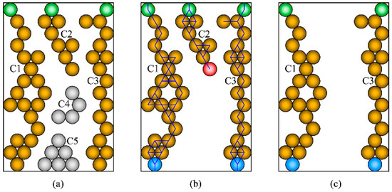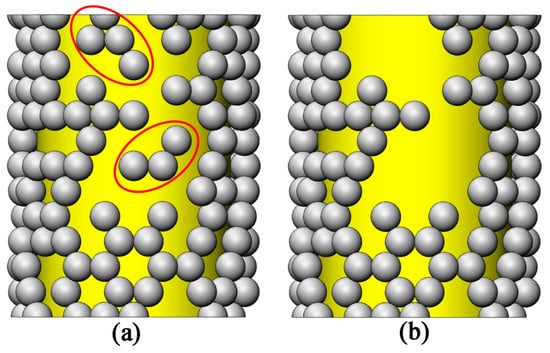 Figure 1 shows the schematic diagram of the developed theoretical model: Straight fibers (yellow cylinders) are randomly arranged in the electrode, acting as the backbone; nanoparticles (gray spheres) are coated on the fiber surfaces in three possible configurations. Depending on the impregnation loading, the shell may be smaller than one layer and one layer may be bigger (Figure 1, from left to right). For a shell, which is not smaller than one layer, the percolation ratio of the particles is 1. However, if the shell is smaller than one layer, the particles are randomly dispersed on the fiber face based on the fifth assumption (Figure 2a). In this case, the must be determined via percolation theory. Several particles cannot be connected to any of the percolation clusters (Figure 2a, red oval frame), and thus do not contribute to the TPB and need to be deleted, as shown in Figure 2b. In this paper, an algorithm was proposed to determine the of the shell that is smaller than one layer.