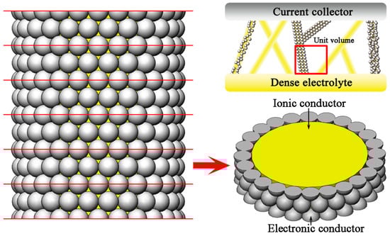 Figure 1 shows that the impregnated fibers are randomly distributed in the electrode. They have different lengths, positions, and orientations. Because of the different volume fraction, the number of fibers also differs. For the TPB calculation, a repeating unit is first abstracted by tailoring the impregnated fiber, as shown in Figure 3. This way, the volume-specific effective TPB length can be given by: