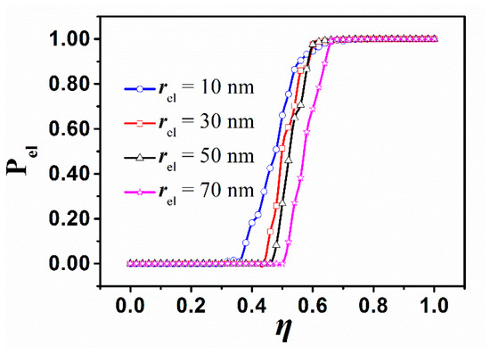 Figure 6 shows the dependence of the percolation ratio on the impregnation loading with different radii of the electron conducting particles . Note that for an impregnation loading below the threshold, = 0 due to no percolating particles existing. Furthermore, the threshold of the impregnation loading increases with the increase of the . This is because the smaller , the more particles around the fiber, which will provide more options from the top to bottom of the fiber and form the percolated cluster. However, for an impregnation loading higher than the threshold, the percolation ratio steeply increases. When the impregnation loading is larger than 0.66, all particles are connected for different , that is, = 1.