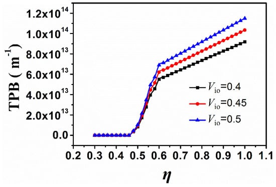 Figure 7 shows the dependence of the TPB length on the impregnation loading. At a fixed , particles do not percolate when the impregnation loading is too low. Thus, the effective TPB length is 0. However, when the impregnation loading reaches the threshold value of 0.48, an effective TPB begins to form and reaches for in the range from 0.48 to 0.6, which can be attributed to the increase in the percolation ratio and coordination number. Compared with , the effective TPB length enhances relatively slowly for . This is due to the fact that the percolation ratio reaches its maximum (1) at and remains constant.