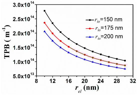 Figure 8 shows the TPB length as a function of the electron-conducting particle radius and ion-conducting fiber radius with the . The TPB length of EE is high on the order of , which is close to the value of IE []. Note that the TPB increases with decreasing or . The TPB length at a value of 30 nm only accounts for 37% of that at a value of 10 nm for . However, the influence of on the TPB length varies. For instance, at a smaller , the TPB length drops more rapidly; at a larger , the influence is weakened. Although finer impregnation particles are favorable for the TPB length, they can also increase the aggregation risk and directly lead to a decrease of the TPB length and bad electrode performance. In practice, the size of the impregnation particles must be carefully controlled to maximize the electrode performance.