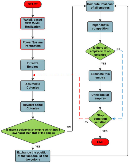 The ICA is used for solving the proposed UFLS optimization problem. In this problem, three objective functions are considered, and their performance are compared. For implementing the suggested algorithm, firstly the system frequency model is online validated using WAMS platform. Once the model parameters such as H, D, and others are obtained. The phasor measurements data using WAMS are assumed to be available in the control center. Then, the most severe disturbance is applied to the SFR dynamic model, and in parallel with this model, ICA is responsible to solve the UFLS problem by trying to find the best amount to be shed in which the frequency is maintained within a specific range. The online implementation of the proposed optimal multi-stage UFLS based on WAMS platform is shown in Figure 3.
