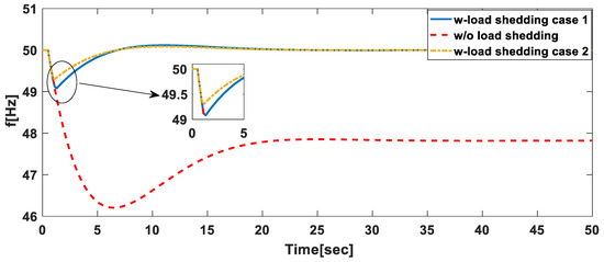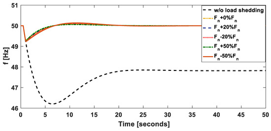 To present the results of the different scenarios considered in this paper, the different cases shown in Table 3 are firstly described. In this regard, the first and second cases ( and ) are optimized using Equation (14). The frequency at which load-shedding is to be done in the event that a contingency has occurred is known and amount to be shed at the frequency at which shedding is to be done has to be optimized for a pre-set time of load-shedding. In cases three to six (–) frequency at which shedding is to be done is determined by the algorithm from the prescribed range as well as the amount of load to be shed. Optimization for Cases ( and ) is done using Equation (12), while for cases ( and ) is done using Equation (13). Table 3 shows the frequency settings and obtained values for load-shedding.