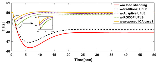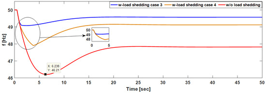 The frequency settings for case 3 were the same as for case 6 while those for case 4 were the same with case 5. The difference in these scenarios in that for case 3 and 4 Equation (12) was used while in case 5 and 6 Equation (13) was used. The results for case 5 and 6 (shown in Figure 9 and Figure 10) were much better compared to the results in case 3 and 4 (shown in Figure 7 and Figure 8). It can be concluded that including the actual load to be shed in the objective produces better results. By comparing case 4 and case 6 it can be seen that in 6 the minimum frequency reached was much closer to 49 Hz.