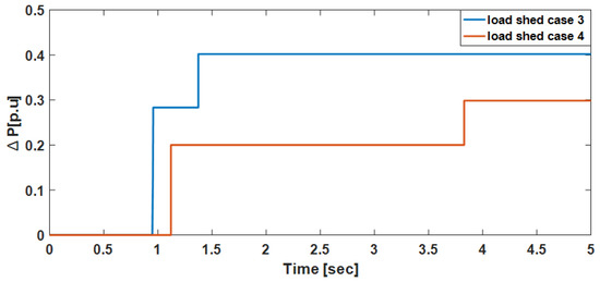 As a further discussion on the results depicted in Figure 5 and Figure 6, in case 2, more load-shedding steps are activated as compared to case 1. In case 1, both the initial and the minimum set frequencies were lower compared to case 2. As a result, we would expect that in case 1 there will be a delay in implementing the load-shedding as evident in Figure 5. In both cases in the first step a large amount of load is shed to quickly arrest the frequency decline however in the second step of case 2 a small load is shed so that the frequency overshoot is maintained within the set limits. If a large load is shed in step 2 of case 2 the overshoot will be higher. Since a small amount is shed in step 2, an additional load-shedding stage is activated in case 2 as compared to case 1.