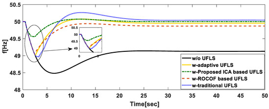 We also compared the proposed ICA algorithm with another stochastic search algorithm. Meta-heuristic algorithms include GA, bacteria foraging, and PSO. These algorithms have proven to be efficient in handling complex nonlinear constraints and to provide high-quality solutions. However, it has been proven that PSO has better performance compared to GA and bacteria foraging algorithms [39,40]. They however have their challenges on convergence and issues to do with dimensionality [39]. We chose the PSO algorithm in our comparisons as this algorithm is recently used to solve the UFLS in [40]. Again, the most severe disturbance in the studied system, i.e., 0.5 p.u is considered. Figure 14 shows the results of the three compared scenarios. Using our proposed ICA-based UFLS specifically case 2 is used and comparing it to PSO suggested in [40] it gave better results. With the PSO suggested in [40] there was delayed shedding and the minimum frequency reached was almost 48.5 Hz. In the same case, a frequency overshoot is experienced, and the frequency finally reached a steady state after 22 s whereas in our case the frequency reached a steady state after 8 s. However, to make the comparison closer to our objective, we solve the proposed optimization problem in our paper using PSO, and compare the obtained result from PSO with the suggested ICA-based optimal multi-stage UFLS scheme. With these adjustments, there was a significant improvement with proposed PSO algorithm compared to the suggested PSO-based UFLS in [40], the minimum frequency reached was almost 48.8 Hz, and the steady-state frequency was reached after about 18 s. This prove that the proposed UFLS optimization problem in this paper is better than [40]. However, our proposed ICA-based optimal multi-stage UFLS scheme still gave better results as we had earlier shedding and the overshoot was smaller due to the suggested optimization problem and the performance of the adopted algorithm.