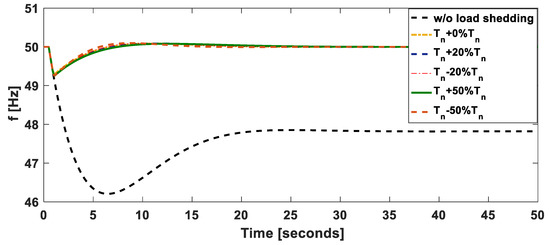 Frequency behavior of the proposed UFLS technique under uncertainties in determining the constant time of the governor-turbine system, T, in SFR model.