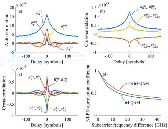 Examples of different auto-correlation and cross-correlations characterizing NLIN. (a) the auto-correlation functions of the first 4 ISI components. (b) cross-correlation functions between different elements of the ISI matrix , and (c) cross-correlation between different ISI orders. The superscripts and denotes the real and imaginary parts of the coefficients, whereas the subscripts , , , and denote the four components of a ISI matrix. For example, the curve marked by denotes the cross-correlation between the real part of the off-diagonal elements of . (d) normalized (Pearson) correlation of the phase-noise component in a multi-subcarrier system. The curves show the correlation between the phase noise affecting two tributaries within the COI, as a function of the frequency separation between them. Results are shown for 64-QAM modulation, and probabilistically-shaped (PS) 64-QAM. All of the results were obtained for a km link of SMF. The auto-correlation and cross-correlation functions of figs. (a–c) were measured for a system carrying 15 WDM channels, whereas in fig (d) 21 WDM channels where used.