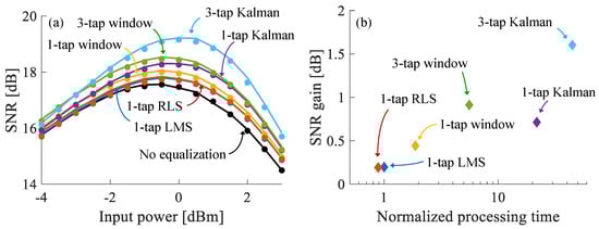 Figure 4. SNR improvement of different equalization algorithms. (a) SNR vs. power for each algorithm. The curves represent results obtained using the Virtual Lab tool [], whereas the dots correspond to split-step simulations. (b) Peak SNR gain vs. computational cost, obtained by measuring the time that was needed to process a single set of symbols for each algorithm. The SNR gain is defined as the difference between the peak SNR of the unequalized case to those of the different algorithms. - Window-averaging algorithmsWindow-averaging algorithms use the fact that the NLIN is temporally correlated whereas other noise sources are not. Therefore, when averaged over a finite time window (possibly weighted averaging), the effects of ASE noise will tend to diminish and an estimation of the ISI coefficients can be obtained. This principle has been used for phase-noise mitigation [,,,], polarization rotation cancellation [,], as well as for higher order nonlinear ISI mitigation [,].We implemented the algorithm described in []. For the single polarization case, it can be summarized by the following procedure.Here is a weighting factor (for example, in [] exponential weighting was used), and is a constant weight function assigned to each filter tap. The parameters and the window weighting functions need to be optimized for each specific transmission scenario.One of the main advantages of this algorithm is its relative versatility. While LMS and RLS each have a single parameter to be optimized, the and can be different for each filter tap, and so they can be adapted to account for the different properties of the ISI coefficients. However, this algorithm tends to be more computationally expensive than LMS or RLS, as the required window sizes can be quite large.