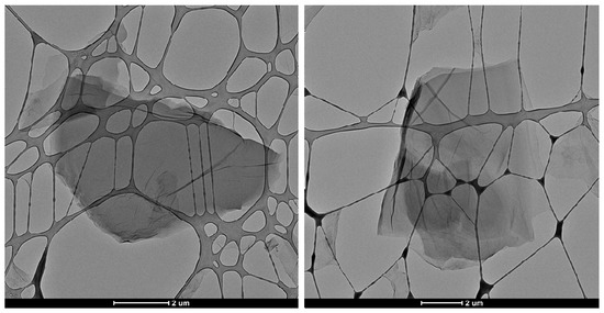 TEM (transmission electron microscopy) images for synthesized GO flakes. The grid matrix seen is part of the support structure holding the GO sample.