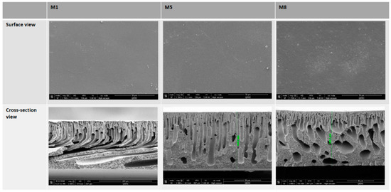 FESEM images of the membrane surfaces and cross-section view of fractured membranes M1, M5 and M8.