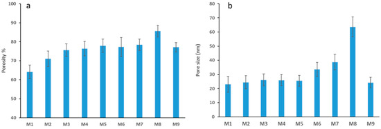 Average total porosity of PES membranes M1 to M9 (a), Average pore size for PES membranes M1 to M9 (b).