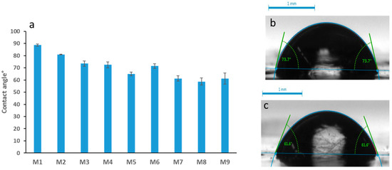 Average contact angle values for synthesized membranes (a), sample photographs of contact angles for M4 (b) and M7 (c).