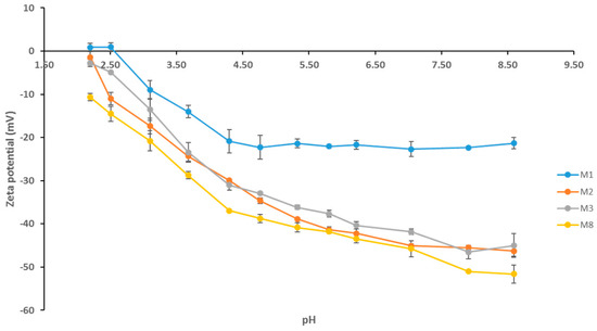 The zeta potential data yielded from the pH scans for selected PES/GO membranes is presented in Figure 7. As can be seen, the neat membrane (M1) possesses the smallest negative charge across all pH values. The surface negative charge of membranes with AG alone (M2) and with AG/GO (M3 and M8) is increased, with M8 having the greatest negative charge overall. At pH 7, for instance, the negative zeta potential increases by over 100% for M8 compared to M1 samples. The increase in negative zeta potentials for the PES/GO/AG membranes in comparison to the neat PES membrane can be attributed to the presence of the hydrophilic residues of the AG which contain carboxylic groups as well as the hydrophilic functional groups that are present on the GO flakes [39]. All membranes show an increase in negative charge as the pH increases. This trend is a result of the selective adsorption of the negatively charged chlorine ions on the membrane surface which leads to charge accumulation [48]. The overall negative surface charge of these membranes renders them attractive candidates in tackling fouling and biofouling issues where the fouling agents are often found to be negatively charged [49].