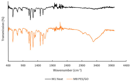 ATR-FTIR (Attenuated Total Reflectance Fourier Transform Infrared Spectroscopy) spectra for synthesized PES neat and PES/GO (M8) membranes.