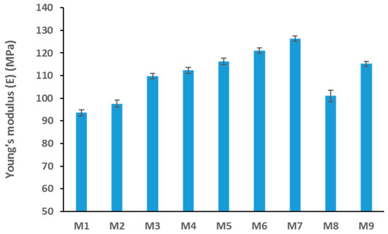 The mechanical strength of the synthesized membranes was tested using the DMA (Dynamic mechanical analysis) technique. Figure 9 shows a clear trend of increased stiffness of the membranes as the GO loading increased up to 3 wt. % loading. The stiffness, inferred from the Young’s modulus values, then decreases at the maximum loading concentration of 5 wt. % GO in M8. The higher the modulus, the more stress is needed to get the same amount of strain, rendering the membrane stiffer or less stretchy. The seemingly surprising result seen for M8 can be explained two-fold. Firstly, we can assume that at a higher loading concentration of GO there will be agglomeration of the GO in the matrix and, secondly, the presence of high quantities of GO may impact the integrity of the membrane’s mechanical strength due to increased porosity as a trade-off scenario [50,51].