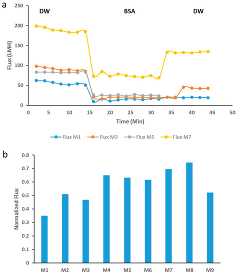 The fouling tests that were conducted using BSA solutions were conducted as described above in the methods section. Figure 10a indicates the membranes’ fluxes at different stages of the fouling test. The M7 sample showed a much higher initial DW flux in the order of three folds higher than the neat membrane’s initial flux with DW. This is expected as it is well documented that membranes with higher hydrophilicity, total porosity and average pore size possess higher flux [33]. All membranes show a decline in flux once BSA filtration takes place. Interestingly, the recovery flux (a DW flux after BSA filtration) varied significantly. Importantly, M7 samples showed much higher flux recovery compared to the neat membrane. The normalized flux data that is shown in Figure 10b sheds more light on the varied recovery ability across each membrane sample. For instance, M8 had a normalized flux which was more than double that of M1 (neat PES membrane). The enhanced performance in terms of flux recovery can be attributed to the increased hydrophilicity and surface charge of the PES/GO membranes.