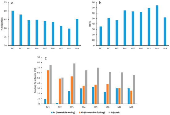 As can be seen in Figure 11a, BSA rejection decreases as the loading of GO increases. The observed decrease can be accounted for by the increase in pore size as the GO content increases (see Figure 5). This inverse relationship between pore size and rejection performance has been reported across many studies [39,52,53]. Conversely, the FRR values in Figure 11b show an opposite trend with a general increase in the flux recovery with an increase of GO content in PES/GO membranes. Remarkably, the FRR value more than doubles when M8 is compared with the neat PES membrane (M1) (36 and 75%, respectively). The increase in membrane surface hydrophilization, coupled with the increased negative surface charge of PES/GO membranes would naturally cause an electrostatic repulsion effect against the negatively charged BSA molecules at a neutral pH (the isoelectric point of BSA being between 4.5 and 5.0) [54]. This would result in less BSA adsorption on the membrane surface and in the pores, explaining the decrease in irreversible fouling that is seen in Figure 11c.