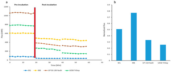 Next, the antibiofouling properties of the fabricated membranes alongside the two commercial membranes were tested. As described in the methods section, the membranes were subjected to E. coli suspension being pipetted on the active surface of the membranes and left incubated overnight at 37 °C. Figure 13a displays the DW flux before incubation (first 20 min) and the DW flux for two filtration cycles of 20 min after the 24 h incubation with bacterial suspension. While all membranes exhibit a drop-in flux after bacterial incubation, M8 samples showed the highest flux recovery as seen in Figure 13b. The normalized flux for M8 not only outperformed the neat PES membrane, however also the commercial Nadir and TriSep membranes (2.5 fold and 3-fold increase, respectively).