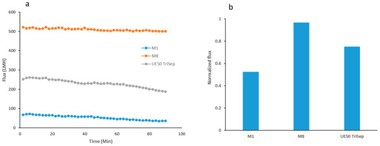 Graph showing flux readings for the filtration of bacterial suspensions for selected fabricated membranes and the UF (ultrafiltration) commercial membrane (a) and the normalized flux for each of the three membranes calculated as the final reading at the end of filtration over the initial reading at the beginning of the filtration test (b).