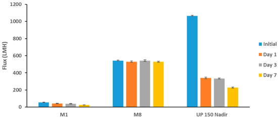 The antibiofouling properties of the PES membranes were further tested alongside the UP 150 (Nadir) membrane after incubation in E. coli suspension at different incubation times (see Figure 15). Despite the commercial membrane having superior initial flux readings (more than double the flux of M8 samples), it experiences the most severe biofouling, as seen in the sharp decline in flux with incubation time. Interestingly, the sharpest drop in flux was in Day 1 incubation where the membrane’s flux plummeted by 68%. Contrarily PES/GO membranes (M8) maintained an almost constant flux when comparing initial flux to final flux at Day 7 of the test period. The same experiment was set up where locally obtained real TSE was used in place of the bacterial suspensions. Once again, the results showed a similar trend where M8 outperformed both the neat membrane and the commercial Nadir membrane (see Figure S5).