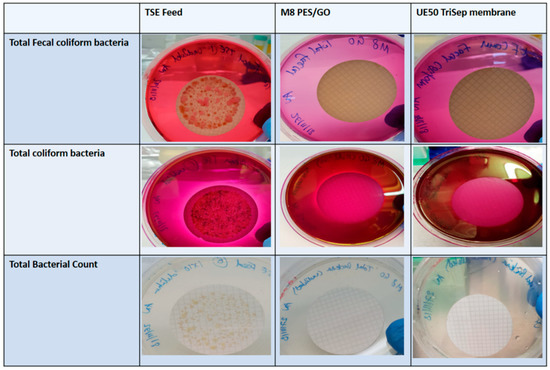 It is well known that activated sludge and other sewage treatment methods employ the use of microbial cells for the biodegradation of compounds that are found in the wastewater [61]. The results for testing the bacterial content in feed TSE water and the permeates that are collected from filtering TSE using M8 and the commercial TriSep UF membranes are shown in Figure 16. As can be seen from the panel, none of the cellulose discs showed any bacterial growth for all three bacterial tests (Total Bacterial Count, Total coliform bacteria and fecal coliforms) from the permeate of both M8 PES/GO membrane and the commercial membrane, indicating that the permeates were bacteria-free. The TSE feed, however, produced an abundance of bacterial growth for all three bacterial tests.