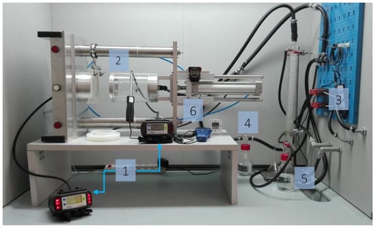 The experimental stand shown in Figure 1 consists of six basic elements, that is, two Dräger X-am 7000 gas analyzers, a pneumatic test chamber, an airflow control system equipped with Red-y for gas flow controllers, a humidifier, a recirculating cooler with a HAAKE SC 100 thermostat, and an evaporator.