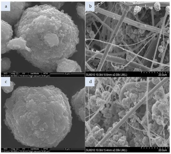 Photomicrograph: (a) unmodified zeolite Na-P1, (b) nonwoven composite with zeolite Na-P1, (c) zeolite Na-P1 modified with HDTMA, (d) nonwoven composite with zeolite Na-P1 HDTMA (magnification: a,c—x30.00k; b,d—x2.00k).