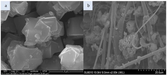 SEM photomicrograph: (a) Molecular sieve SM, (b) nonwoven composite with SM (magnification: a—30.00k, b—2.00k).