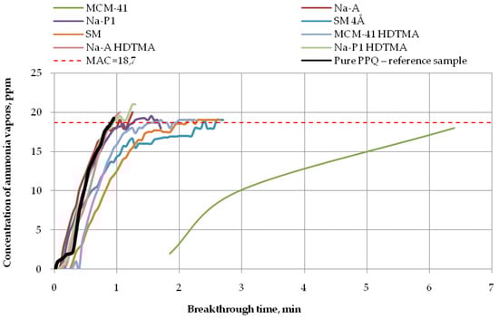 The longest breakthrough time against ammonia vapors (more than 6 min) at 18.7 ppm was found for the nonwoven composite containing the mesoporous silica material PPQ + MCM-41, while the other composites incorporating zeolite, whether modified or not, practically did not exhibit protective properties against this compound (Figure 7). These results are in accordance with the literature data [] as interactions occurring between modified zeolites and ammonia effectively improve their ionic conductivity. In addition, elevated temperature accelerates ammonia adsorption/desorption kinetics, thus decreasing the adsorption capacity of zeolites. The reaction time was 1 min for the composite containing mesoporous silica material modified with HDTMA, 2 min for the composite with the molecular sieve SM, and more than 2 min for the one with the molecular sieve SM 4Å, in relation to the reference sample. The longest breakthrough time against ammonia vapors was obtained for the mesoporous silica material characterized by a large specific surface area (953.30 m2/g) and the greatest pore volume among the tested materials (0.85 cm3/g). These results are consistent with other reports [,,]. Materials characterized by very high specific surface areas, containing pores of various shapes and sizes throughout their volume, ensure better contact between the active sites on their surface with adsorbate particles. There is a close relationship between the size of the specific area and the pore size.