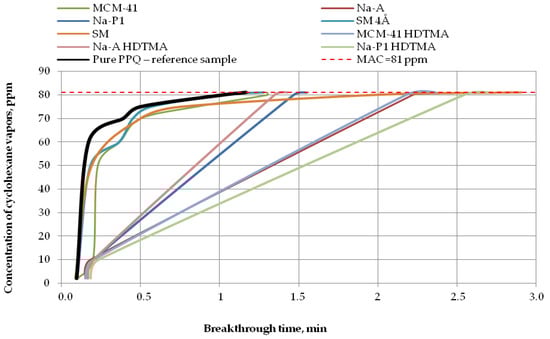 In the case of cyclohexane vapors at a concentration of 81 ppm, the nonwoven composite containing zeolite Na-A HDTMA revealed the maximum penetration of the test substance after 1 min, the composite containing zeolite Na-P1 after 1.5 min, and composites with MCM-41 HDTMA, Na-A, and the molecular sieve SM after 2 min. The longest reaction time to cyclohexane vapors, more than 2.5 min, was found for the composite containing zeolite Na-P1 HDTMA (Figure 8). Thus, zeolite modification led to a longer breakthrough time against cyclohexane.