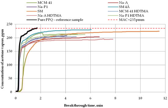 Finally, the longest breakthrough time against acetone vapors (more than 11 min) at 235 ppm was found for the nonwoven composite containing the molecular sieve SM (zeolite ZSM-5), as shown in Figure 9. The application of the molecular sieve SM 4Å resulted in 232 ppm downstream of the sample after 6 min. In turn, after 5 min, that concentration ranged from 200 ppm to 220 ppm for the zeolite composite PPQ + Na-P1 HDTMA and the silica composites PPQ + MCM-41 and PPQ + MCM-41 HDTMA. The composite with zeolite Na-A exhibited a downstream concentration of acetone vapors of 200 ppm after 6 min. This means that the composite with the longest breakthrough time contained the molecular sieve SM, characterized by a specific surface area of 352.6 m2/g at a pore volume of 0.13 cm3/g. The following (Table 3) is a presented summary of data obtained for the assessment of the action of adsorbents used to remove ammonia, acetone, and cyclohexane from the air.