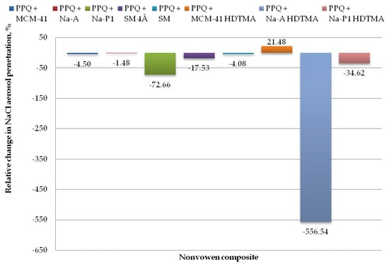 The mean NaCl aerosol penetration results for the studied nonwoven composites containing zeolite and silicate materials are given in Table 4, with relative changes shown in Figure 10. Deterioration of protective and functional properties of the composite materials in relation to the reference sample is marked with negative values, while the improvement of protective and functional with positive values. On the basis of the statistical analysis performed, no significant differences were found, although absorbent materials with different textural parameters were used.