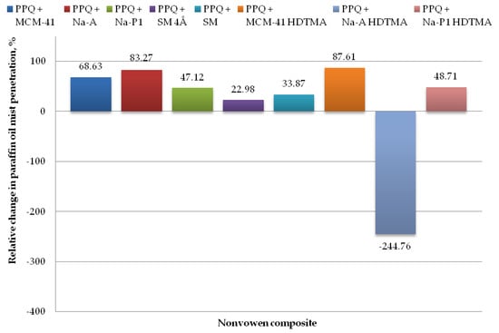 The mean paraffin oil mist aerosol penetration results for the tested nonwoven composites containing zeolite and silica materials are given in Table 5, with relative changes shown in Figure 11. Deterioration of protective and functional properties of the composite materials in relation to the reference sample is marked with negative values, while the improvement of protective and functional with positive values. Based on the statistical analysis performed, no significant differences were found, although absorbent materials with different textural parameters were used.
