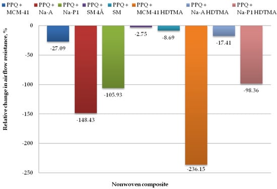 Relative change in airflow resistance for nonwoven zeolite and silica composite.