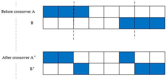 In this paper, we adopted the two-point crossover strategy, which was helpful to create more new individuals. Two-point crossover refers to the random setting of two crossover points in the individual coding string and then the partial genes between the two crossover points will be exchanged. An example of a two-point crossover operation is shown as Figure 2, wherein the dotted lines represent the two crossover points.