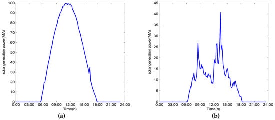 where loss1 is to guarantee the loss value is small enough, loss2 is to ensure the residual error between the allocated load and the input solar is small enough, and is used to control the two variables. Here, we set . Figure 3 shows the input solar generation power on the two days, where Figure 3a,b correspond to sunny and cloudy/snowy weather conditions respectively.