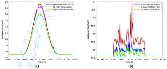 In Figure 4a, the upper curve illustrates the first scenario mentioned in Section 5.1, which means only one datacenter was integrated into the case_ieee30 at bus 15. The power of the datacenter varied along with the input solar generation. As shown in the figure, the peak loss is 25.6 MW. The curve in the middle illustrates the second scenario, in which two datacenters were integrated into case_ieee30 at bus 15 and 25. In this case, the two datacenters consumed an equal amount of power and the sum of the two datacenter’s power was consistent with the input solar generation. Besides, the solar station was still at bus 9. We can find the peak loss value was smaller than in scenario 1, which was 25.25 MW. The lowest curve demonstrates the third scenario mentioned in Section 5.1. In this case, two datacenters were integrated into to case_ieee30 at bus 15 and 25 respectively and the power of the two datacenters was dynamically adjusted according to changes in solar power generation, while the total power consumption of the two datacenters was kept constant. We found that the loss value was smaller than in scenarios 1 and 2, which was 23.93MW at the peak. In Figure 4b, which illustrates that for the results under cloudy/snowy weather conditions, the peak loss values in the same three scenarios were 20.99 MW, 19.82 MW, 18.08 MW respectively and the average value in the third scenario was still the lowest.