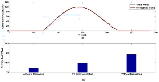 In the following experiments, we adopted the framework “Keras” based on neural networks to forecast the generation of power. Figure 7 shows that forecasting results under sunny weather conditions, in which Figure 7a shows the comparison of the predicted values and the actual values, and Figure 7b shows the average power losses under three different accuracy settings. It can be observed that leveraging forecasting techniques are helpful to eliminate the negative impact of action delay time.