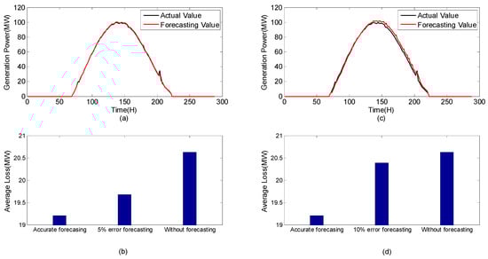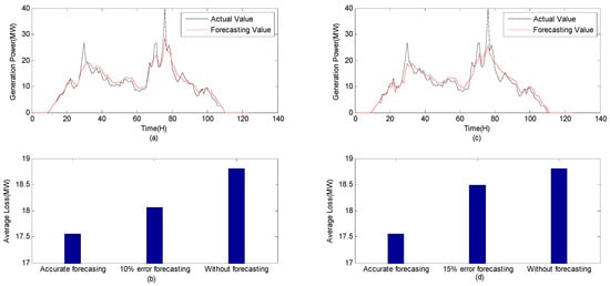 In order to verify the effectiveness of our prediction method, we also carried out the same experiments under cloudy/snowy weather conditions and the results are shown in Figure 9. The forecasting average error in Figure 9a,c is 10% and 15% respectively. Figure 9b,d shows the average power losses under different accuracy settings, including 10%/15% forecasting error, accurate forecasting and without forecasting. Figure 9 also illustrates that although on cloudy/snowy days the data fluctuations make the forecasting difficult and less accurate, we can still see the advantages of leveraging the forecasting techniques to help reduce extra power losses. To sum up, a reasonable forecasting method can eliminate extra losses from the action delay of the datacenters as much as possible, so it is meaningful to adopt an appropriate forecasting method to improve the impact of datacenter reaction on the grid.