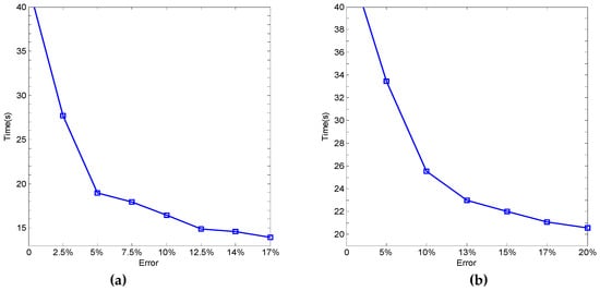 In addition, we also examined the relationship between forecasting accuracy and the computation time. In general, in order to get more accurate prediction results, it has to spend more time on the computation process. Figure 10 illustrates the evaluation results for both the sunny and cloudy/rainy/snowy weather conditions under a 10-min action delay. From Figure 10a we can see that nearly-accurate forecasting takes more than twice the time compared to achieving 95% accuracy, while in contrast, to achieve 95% accuracy only takes 3 s more than to achieve 90% accuracy. Similarly, from Figure 10b we can see that accurate forecasting takes more than twice the time compared to achieving 85% accuracy, while to achieve 90% accuracy only takes 4 s more than to achieve 85% accuracy. This implies it could be practical and helpful to spend a little more time to get better forecasting results. Besides, comparing Figure 10a,b, it can be observed the forecasting time cost of the cloudy/rainy/snowy day is much higher than the sunny day. For example, in Figure 10a it only takes about 17 s to achieve 90% accuracy but in Figure 10b it takes nearly 26 s.