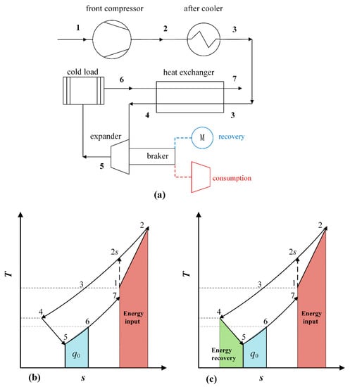 Flow process and T-s diagram of a cryogenic reverse Brayton refrigerator: (a) Flow process; (b) T-s diagram of energy consumption; (c) T-s diagram of energy recovery.