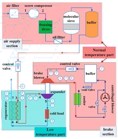 As shown in Figure 2, the schematic view of the test rig is presented. The system used air as the working fluid and run in an open cycle. The normal temperature part is divided as the air supply section and the brake section. The screw compressor can provide 260 Nm3 h−1 compressed air at 1.00 MPa. The cooling and filtering devices (a filter, a freezing dryer and a molecular sieve) are applied to cool down the high temperature gas and remove the water and oil in the system. The cold box has a vacuum degree of 0.01 Pa, consisting of a cryogenic plate-fin heat exchanger, a cold load, and pipes. The expander was the same as the one shown in Reference []. It has a diameter of 24.00 mm, and was supported by foil air bearings. The expander inlet operates in the range of 0.300–0.600 MPa, and the outlet is slightly higher than environmental pressure. The design isentropic expander efficiency is 0.578. The heat exchanger is a plate-fin regenerator and the design effectiveness is 0.930. The low temperature part and the air supply section are similar to those in References [,]. While, the brake section is improved and quite different from the previous one in References [,]. In the present study, the brake section is an independent and complete circuit. As shown in Figure 2, a centrifugal blower is applied to make the pressure in circulation can meet the demand of tests. When the required brake pressure is high, the valve is switched and the centrifugal blower runs to raise the pressure. When the brake pressure is low, the centrifugal blower stops working. The brake gas is not supplied by the air supply section any more []. It is a benefit for the stability of the system and accurate calculation of energy efficiency. The blower has a diameter of 27.00 mm. Based on the NI data acquisition board and the LabVIEW program, a real-time data acquisition, calculation, and display system was developed for the effectively dynamic control of the refrigerator.