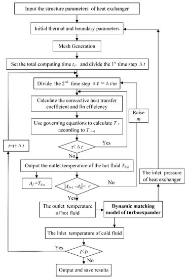 The flow chart of the simulation method is shown in Figure 5. With a brake of energy consumption, the simulation method is the same as the one in Reference []. In the dynamic cooling process, the total computation time is tt, and the 1st time step is . In the 1st time step, is divided as the 2nd time step. In , inlet temperature of the heat exchanger at the cold side is assumed to be equal to the expander outlet temperature, and they are considered as constant. Then the transient convection heat transfer in the heat exchanger is calculated by in . At the end of , the outlet temperature at the hot side of the heat exchanger is obtained through simulation. That is, the expander inlet temperature is got. Then, the expander outlet temperature could be calculated according to the matching model and the transient state in next could be simulated later. The heat exchanger is calculated using the method of numerical heat transfer and computational fluid dynamics by considering both the heat conduction and cold loss [,].