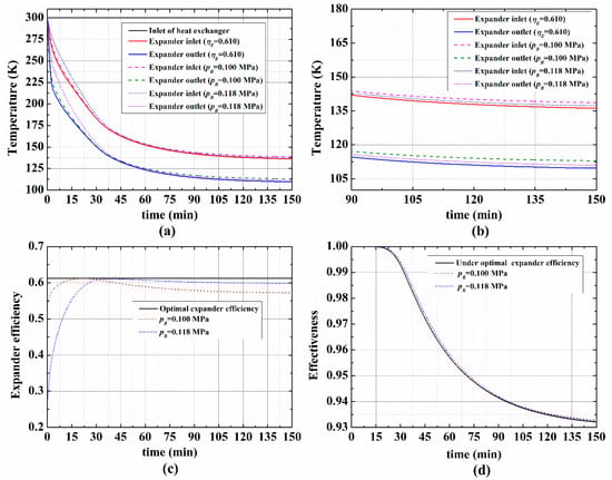 As shown in Figure 6, the dynamic cooling characteristics of the refrigerator under different operation modes are presented. In the beginning, the cooling speed of the refrigerator with optimal expander efficiency is significantly faster than those under certain brake pressure. As the cooling goes on, the cooling speeds of different conditions became similar, as shown in Figure 6b. The expander efficiency under brake pressure of 0.100 MPa increases first and then decreases, and it reaches the optimal value at the 18th min. The expander efficiency under brake pressure of 0.118 MPa reaches the optimal value at the 36th min. In most of the cooling period, the expander efficiency under brake pressure of 0.118 MPa is higher than the one under brake pressure of 0.100 MPa, and is closer to the optimal one. As shown in Figure 6d, the refrigerator with this brake pressure also has higher effectiveness of heat exchanger.