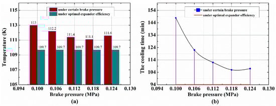 More working conditions were simulated to evaluate the operation modes, as shown in Figure 7. The lowest ultimate refrigerating temperature is achieved under optimal expander efficiency, and the value is 109.7 K. With the increase of brake pressure, the ultimate temperature decreases first and then increases. It comes close to the lowest one in the brake pressure range of 0.112–0.124 MPa, as shown in Figure 7a. The ultimate temperature is 111.1 K at the brake pressure of 0.118 MPa. The highest ultimate temperature of the refrigerator is 113.0 k, which is obtained at the brake pressure of 0.100 MPa. The required times for the refrigerator to achieve this value were compared under different conditions, as shown in Figure 7b. When pB = 0.100 MPa, it takes 148 min for the refrigerator to reach 113.0 K. Under optimal expander efficiency, the required time is 54 min shorter than the longest one. The shorter cooling time means the shorter energy and economy cost. When pB is around 0.118 MPa, the cooling time is quite near the shortest one and the deviation is about 10 min.